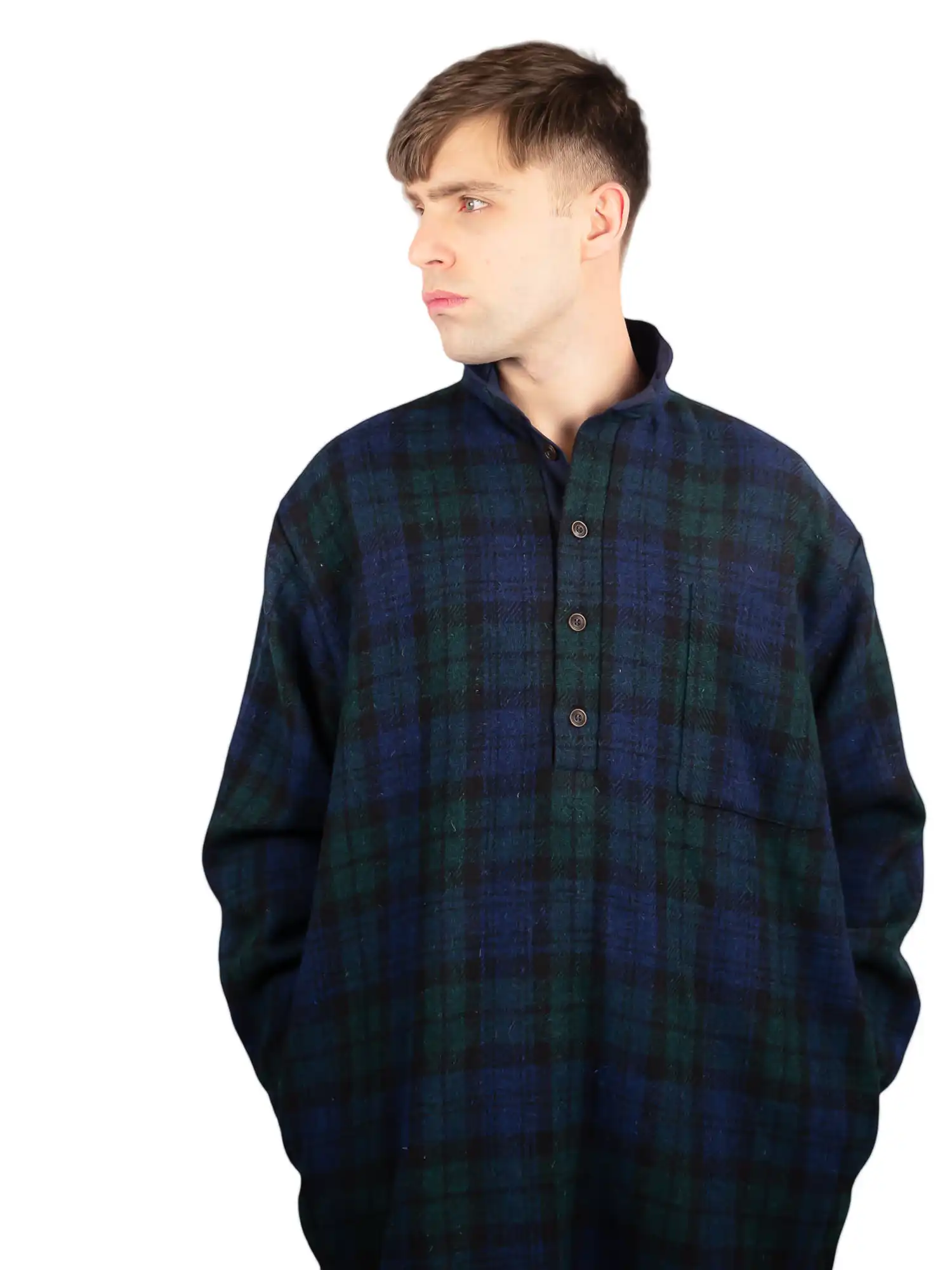 Traditional Harris tweed hand woven into the modesty movement. The iconic Black Hawk Scottish fine wool umbrellas the Midnight Wool Khurta. Protected band collar slinks into an overhung garment. Buttoned down to the chest, dropped shoulders, and deep pockets. This will make you feel comfort and strength. Soft wrist cuffs to test time, shielded breast pocket, this elegant garment is familiar yet rare. Single centred pleat at the back promenades the emblem. Choose the new heritage.